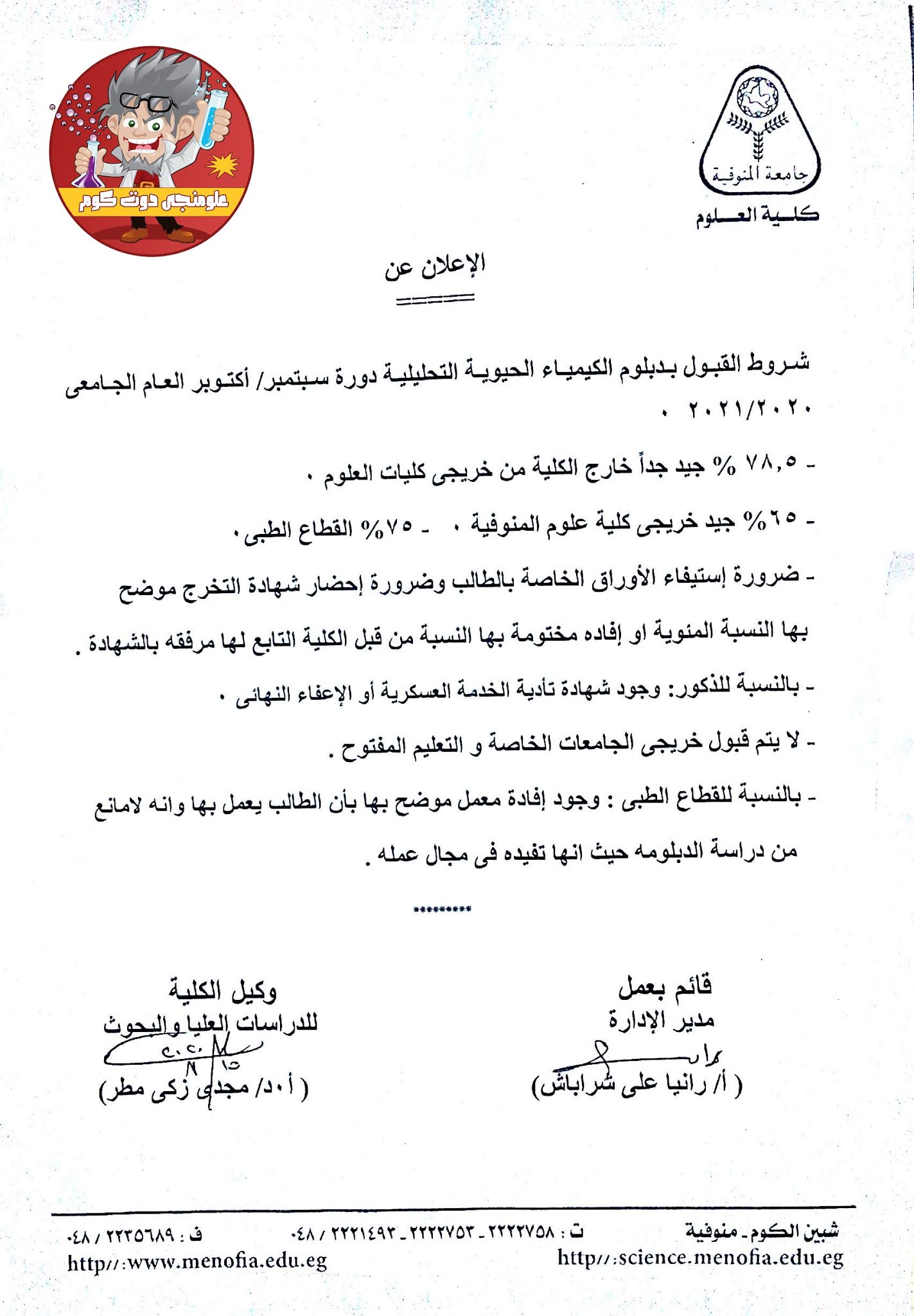 دبلومة الكيمياء الحيوية التحليلية علوم شبين الكوم جامعة المنوفية علومنجى دوت كوم